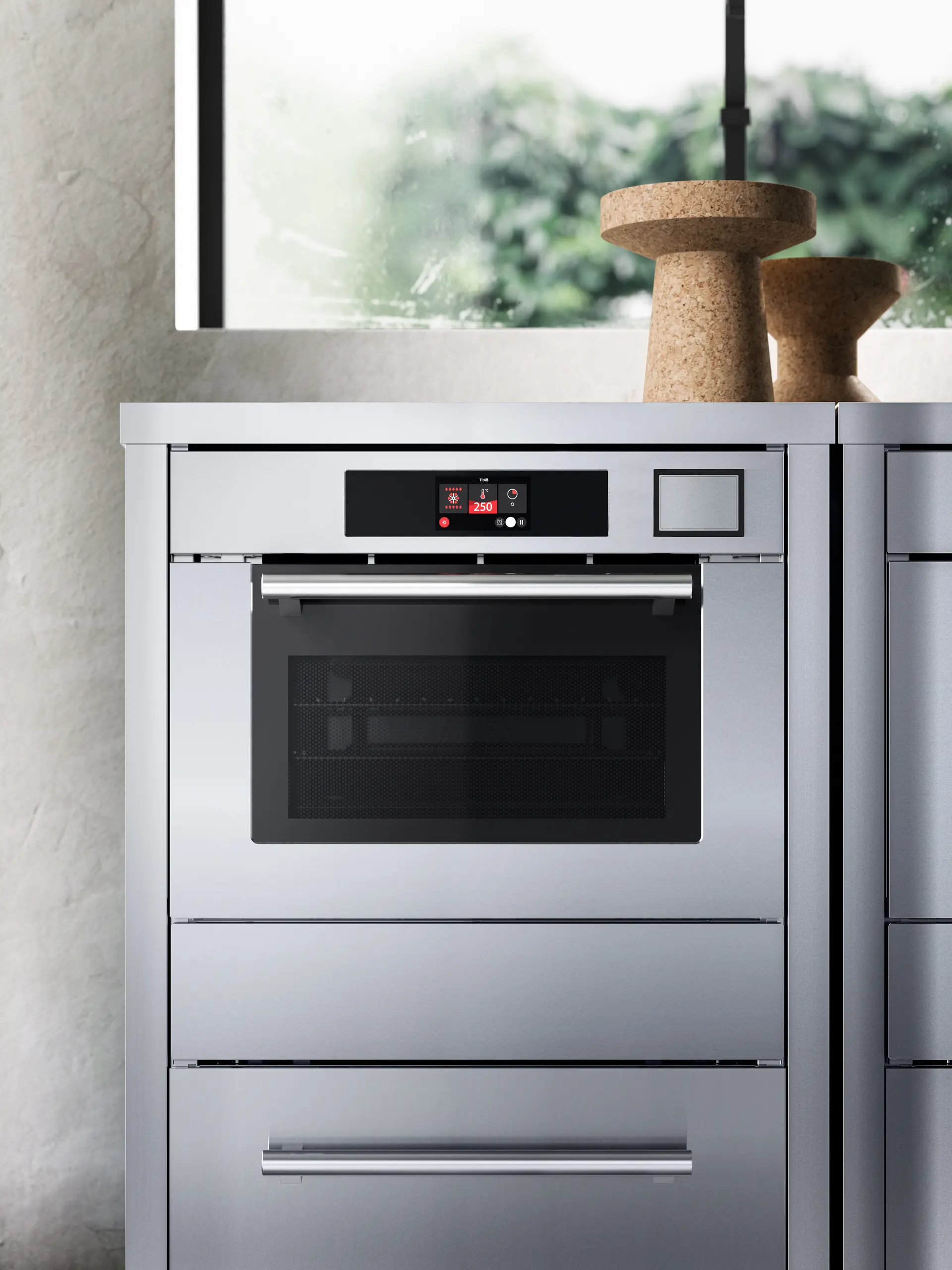 Многофункциональный компактный электрический духовой шкаф с функциями пароварки и микроволновой печи.